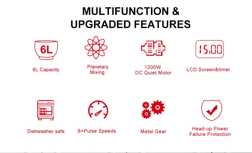 BioloMix Mélangeur sur socle de cuisine, mélangeur, moteur silencieux, fouet à œufs crème, pétrin de pâte fouet, 6 vitesses, 1200 W, 6 L, DC